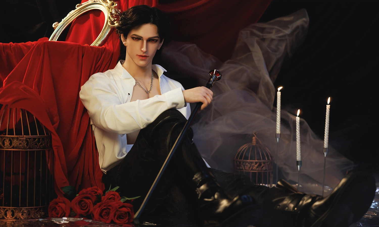 ドールのフェイスメイクは、経験豊富なメイクアーティストが一体ずつ丁寧に仕上げています。男性ドール特有の骨格構造を基準に、眼窩・鼻梁・唇の山などの要所を重点的に描写。繊細かつ抑制の効いた陰影表現によって、顔の立体構造と輪郭の深みを強調しています。